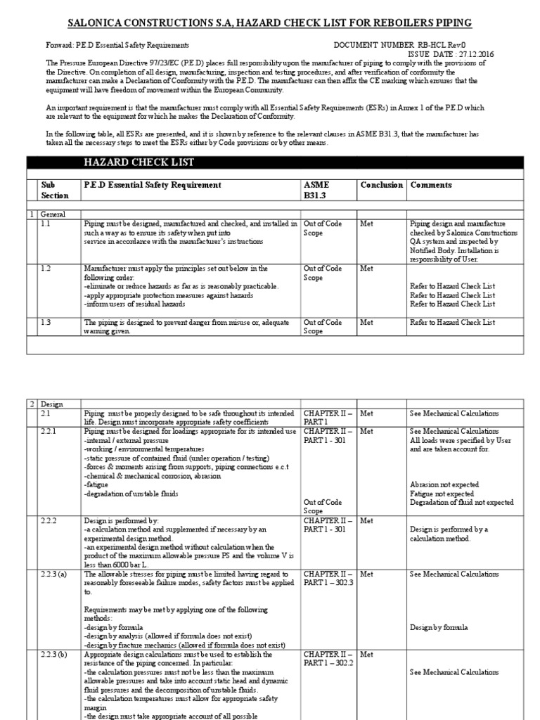 Hazard Check List P E D Asme B31 3 Safety Applied And Interdisciplinary Physics